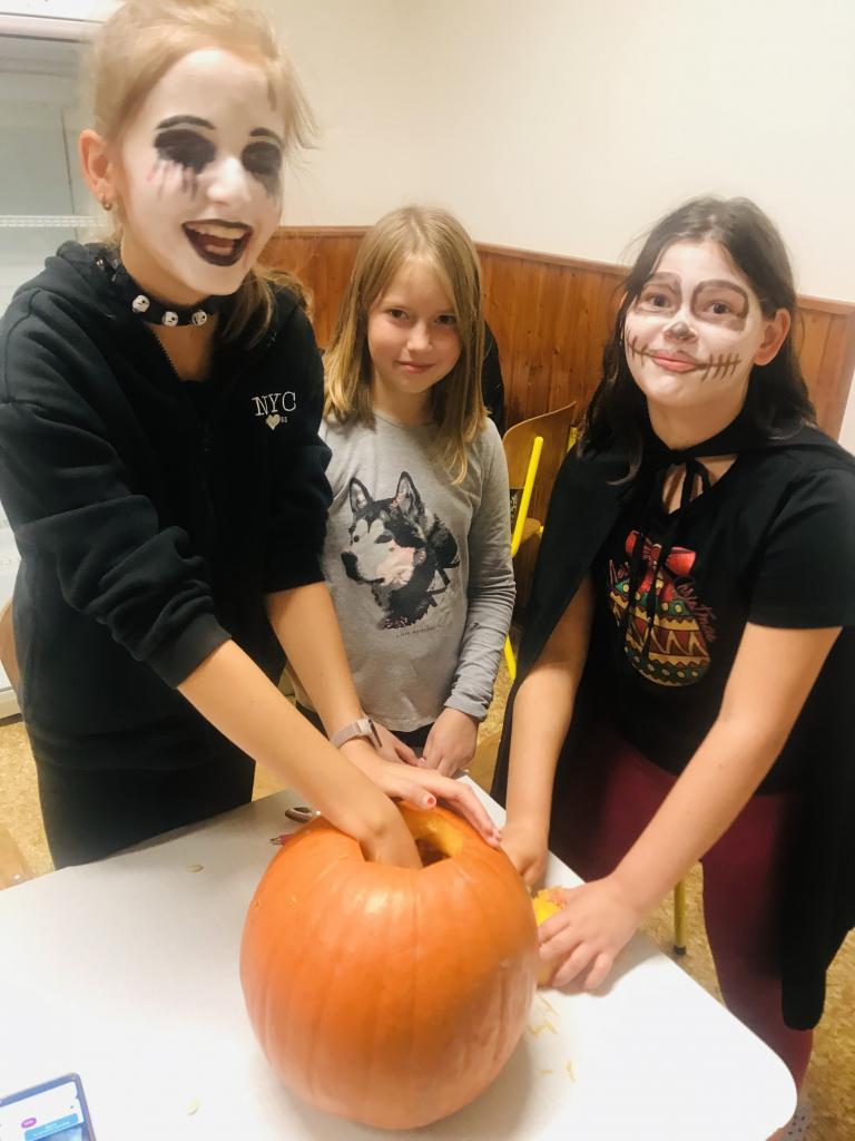 Halloweenskou noc si přišly užít všechny nebojácné děti do knihovny v pátek 21.10.2022. Dlabaly a zdobily dýně, vyráběly duchy z papíru a setkaly se se strašidly na dvoře za školou, kde musely podle obrázků vyluštit strašidelnou tajenku. U kostlivce se plnily různé úkoly a za každý správný obdržely písmenko do tajenky, která jim správně složená označila místo halloweenského pokladu. K večeři si opekly párky na ohni. Nočního dovádění si ještě užívaly u her a soutěží do půlnoci v tělocvičně. Na dobrou noc, která nastala u některých z nich až nad ránem, jsme si přečetli strašidelné příběhy a shlédly pohádku.