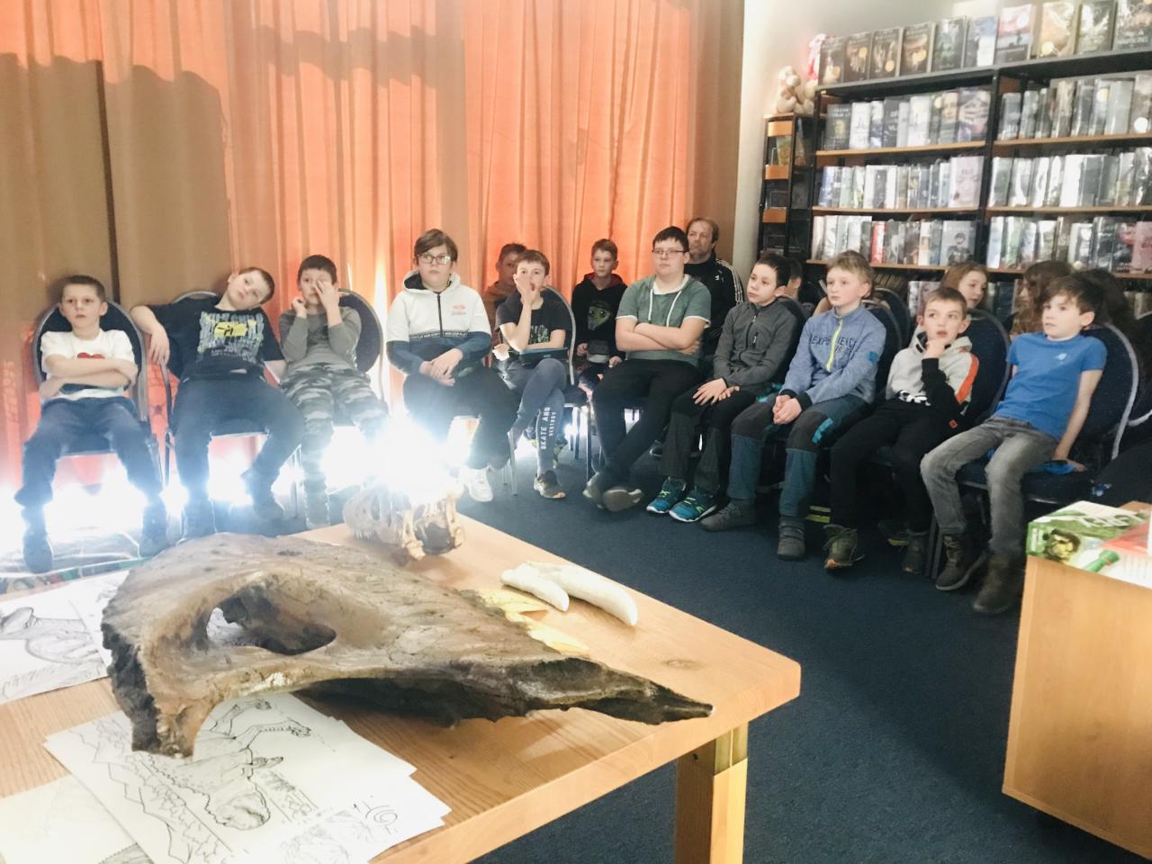 Zajímavou přednášku si užily děti ze základní školy v knihovně, při které se přesunuly o několik milionů let do historie, kdy naší planetě žili a vládli dinosauři. O nich nám poutavě přijel vyprávět přírodovědec, pedagog, spisovatel a publicista pan RNDr. Vladimír Socha z Hrade Králové. Nejvíce dětem přiblížil život obřího dravého dinosaura Tyranosaura rexe a dalších největších žijících ještěrů. Pan Socha se v minulých letech účastnil paleontologických výzkumů v USA. Děti si měly možnost prohlédnout dovezené exponáty - část čelisti dinosaura a zuby. Ti starší si zkusily mini pracovními nástroji vysekat dinosauří kosti ze sádry a vypracovat po přednášce pracovní listy, menší děti si odnesly omalovánky s motivy různých dinosaurů.