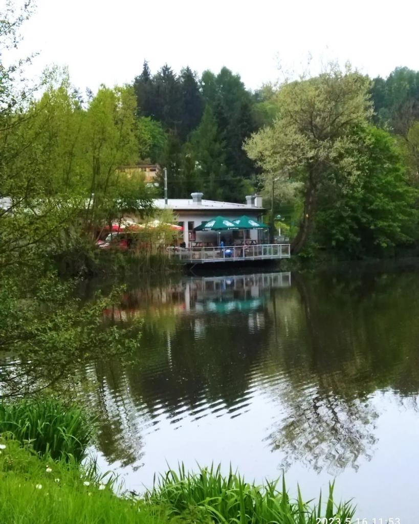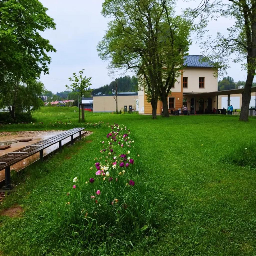 Po prohlídce jsme si ještě prošli okolí zámku s Piccolominskou zahradou a pak sjeli k rybníku Podborný, kde jsme v restauraci na jeho břehu poobědvali. Měli jsme v plánu prohlédnout si Náchod, ale překazil nám to hustý déšť a tak jsme po občerstvení pokračovali do městské části Běloves, kde byly v roce 2019 otevřeny Malé lázně. Je zde postavena replika vily Komenský, ve které je stálá expozice o lázeňství, kavárna s cukrárnou a kolonáda, pojatá jako odpočinková zóna.